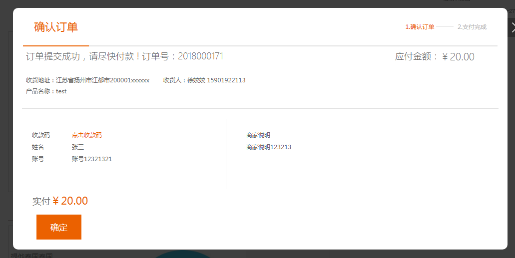 ③.pc前台页面预览:提交订单之后,会出现下方弹窗,展示了后台填写的相关收款信息