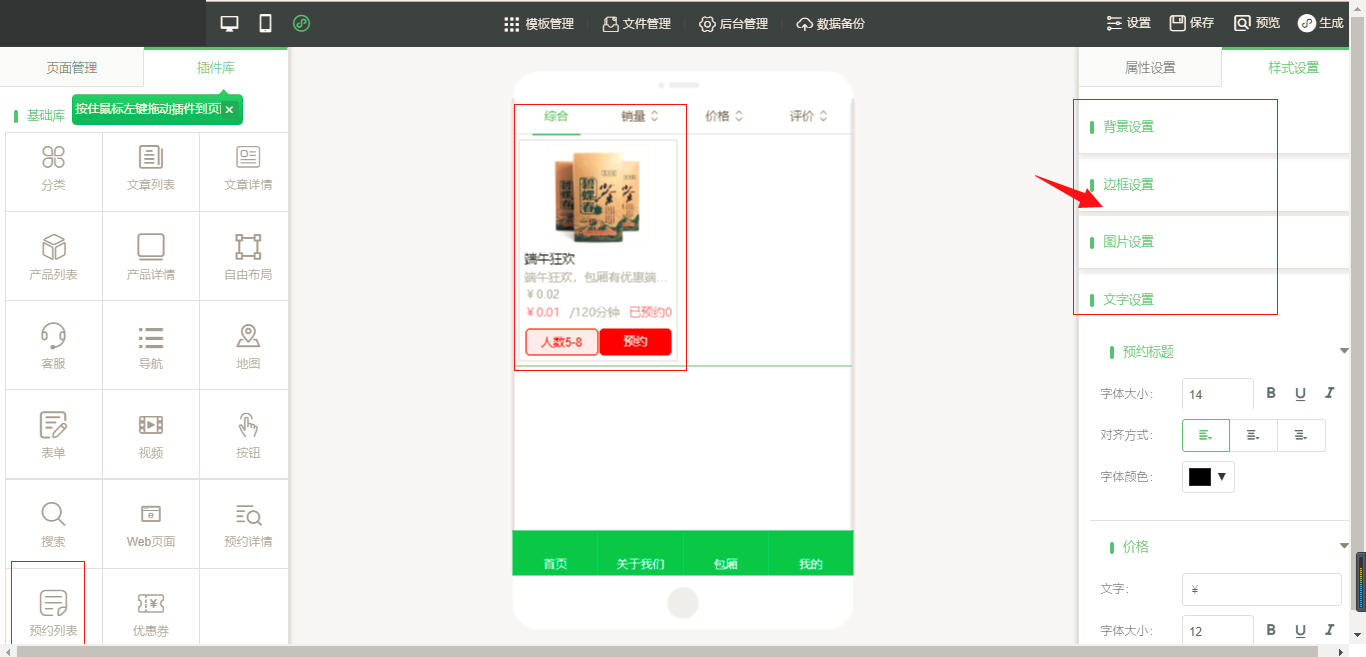 8.在小程序编辑器中拖入“预约列表”插件,会显示除在后台添加的预约产品列表,在属性设置中我们可以进行一些“排序设置”、“显示设置”和“搜索栏设置”等,在“样式设置”中同样也有一些设置项,比如“文字设置”就可以改变页面中的文字颜色,字体等内容,(注意的是要将该列表链接至含有“预约详情”的页面),如图所示: